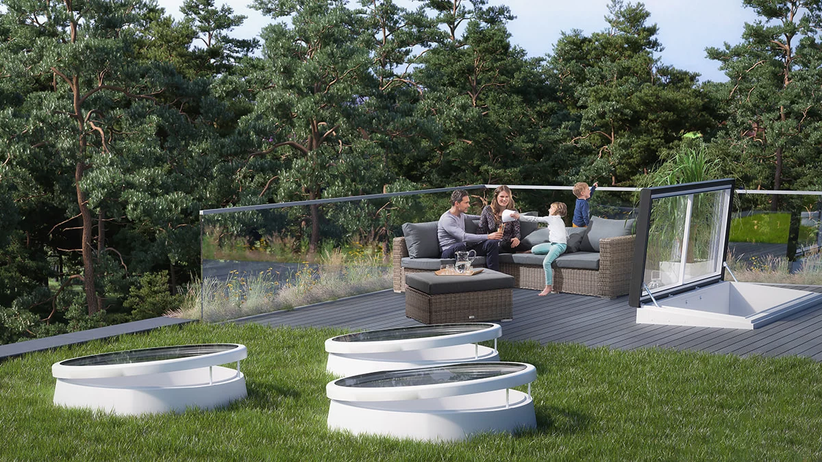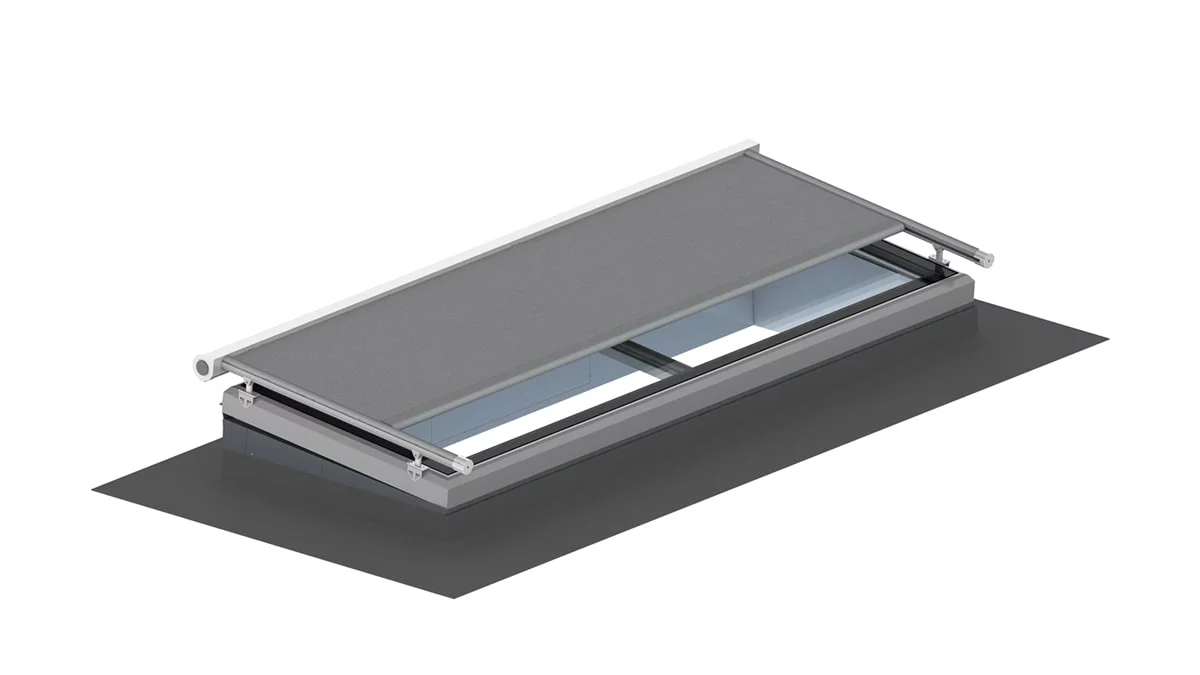 Upad dnevnog svjetla i unos solarne topline stvaraju širok potencijal za usmjeravanje energije u zgrade i time omogućuju uštedu troškova grijanja i umjetne rasvjete. Naravno, to se ne smije događati nekontrolirano, već mora biti podesivo pomoću kontroliranih sustava zasjenjivanja. Vanjski sustav zasjenjivanja za naš LAMILUX izlaz na ravni krov Comfort Swing prikladan je za to. S uvlačivim klizačima optimiziranim za buku, vanjska se tenda može jednostavno izvući pomoću tipki ili daljinskog upravljača, što omogućuje optimalnu kontrolu količine dnevnog svjetla koje ulazi u prostoriju. Provođenje kabela je skriveno i integrirano u gornji element.