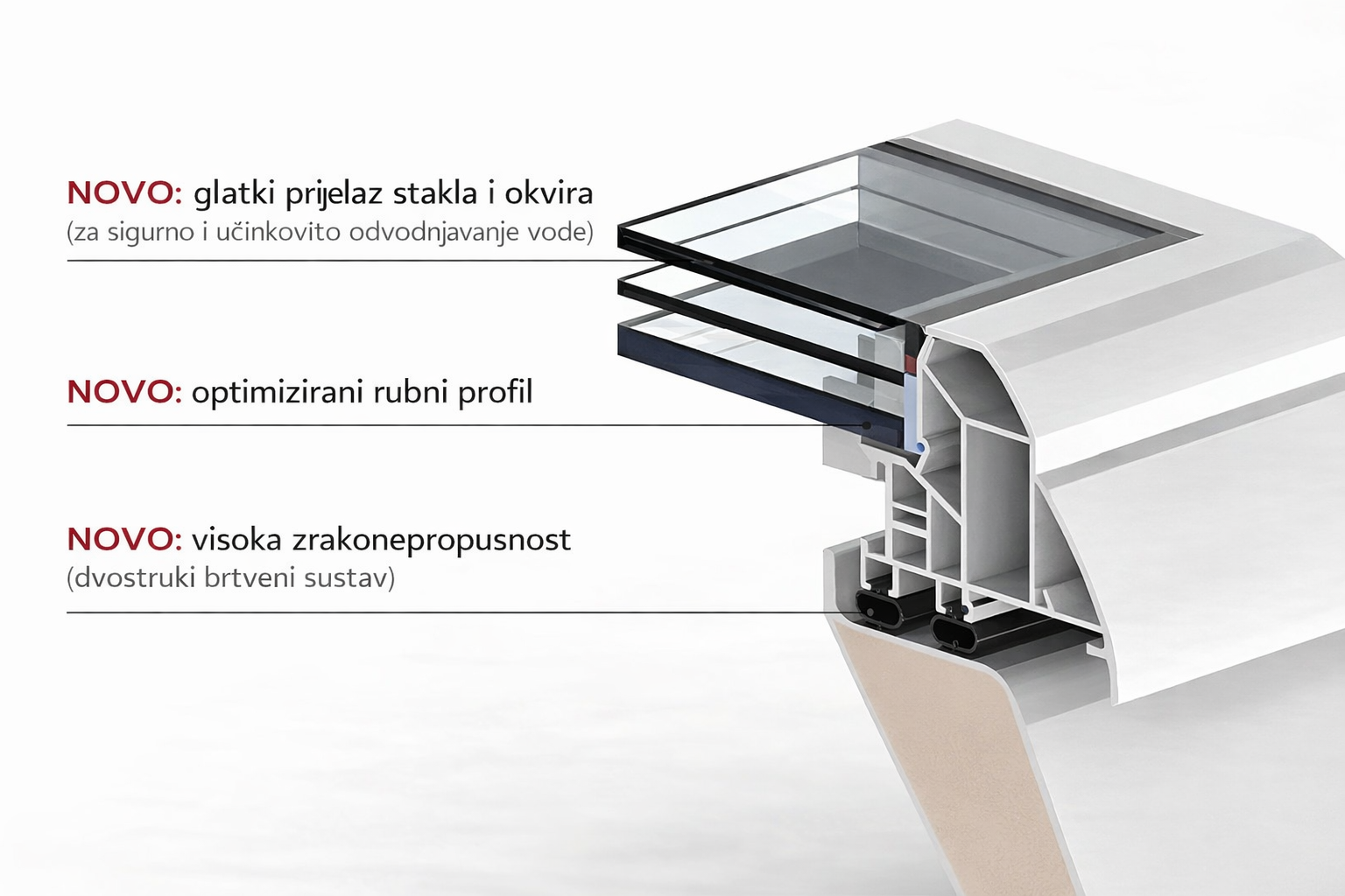 • Širok izbor ostakljenja: dvoslojno ili troslojno termoizolacijsko staklo (Ug do 0,95 W/(m²K)); opcionalno: matirano ili s prozirnom zaštitnom folijom